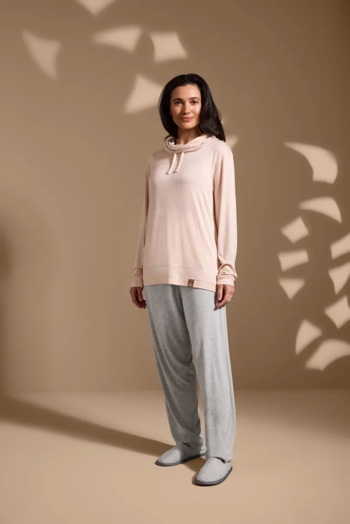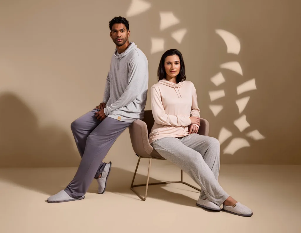 Дамският комплект е в нежно розово и светлосиво, а мъжкият – в елегантна двуцветна сива гама. Комплектът се допълва от чехли и маска за очи, също изработени от модал. Чехлите имат плюшена вътрешна подметка, а маската за очи е подплатена с ултрамека копринена материя за непрекъснат сън.