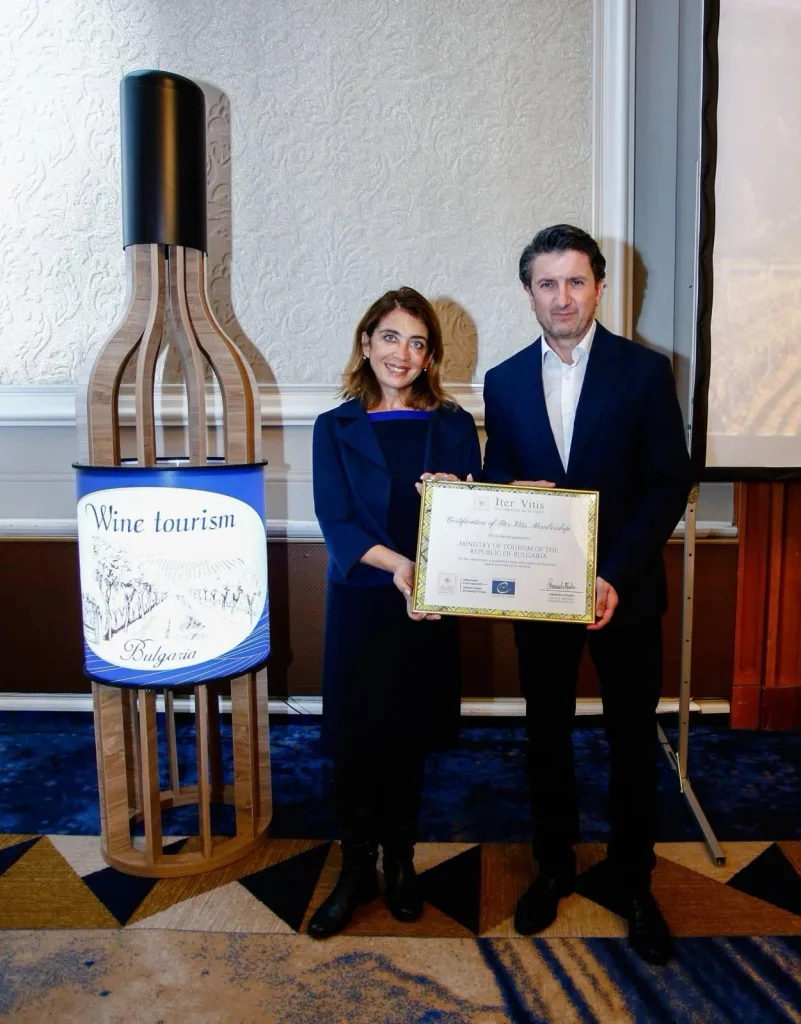 Министерството на туризма получи официалния сертификат за членство в престижния европейски културен маршрут „Пътят на виното“ (Iter Vitis), връчен на министъра на туризма Мирослав Боршош като признание за включването на България в мрежата от водещи европейски дестинации, посветени на опазването и популяризирането на виненото наследство.