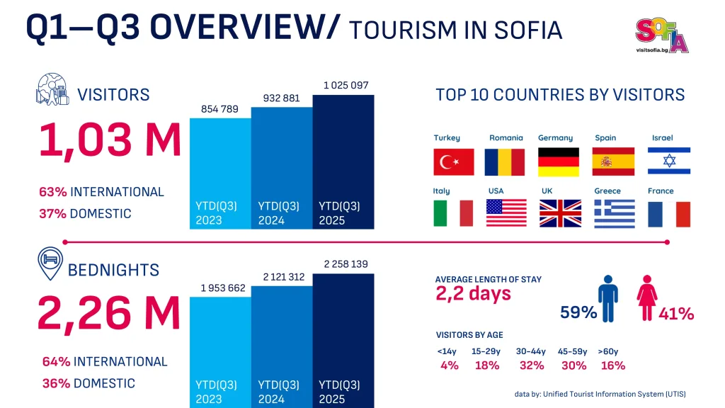 За периода януари – септември 2025 г. столицата София отчита 10% ръст на туристите и 6% увеличение на нощувките спрямо същия период на 2024 г.